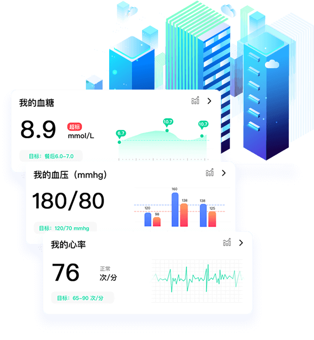 健康模塊,飽含血糖、血壓、尿酸、心率以及運(yùn)動(dòng)健康指數(shù),為用戶提供數(shù)據(jù)云儲(chǔ)存、健康預(yù)警。系統(tǒng)還可根據(jù)用戶平時(shí)的檢測指數(shù),運(yùn)算出健康目標(biāo)值